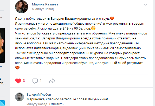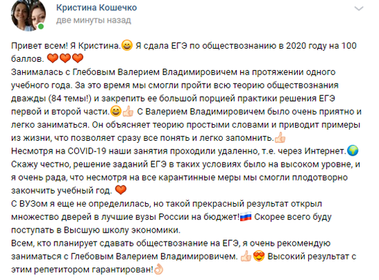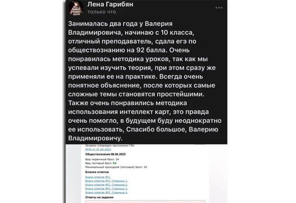 Подготовил более 340 учеников, сдавших ЕГЭ на высокие баллы (80+, 90+ и 100). Благодаря отлично сданному экзамену, ученики поступили на бюджетные (бесплатные) места в такие престижные российские вузы как НИУ ВШЭ (Высшая Школа Экономики), Финансовый университет при Правительстве РФ, Российская академия народного хозяйства и государственной службы при Президенте Российской Федерации (РАНХиГС) и другие.