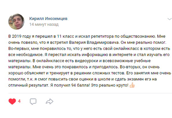 Подготовил более 340 учеников, сдавших ЕГЭ на высокие баллы (80+, 90+ и 100). Благодаря отлично сданному экзамену, ученики поступили на бюджетные (бесплатные) места в такие престижные российские вузы как НИУ ВШЭ (Высшая Школа Экономики), Финансовый университет при Правительстве РФ, Российская академия народного хозяйства и государственной службы при Президенте Российской Федерации (РАНХиГС) и другие.